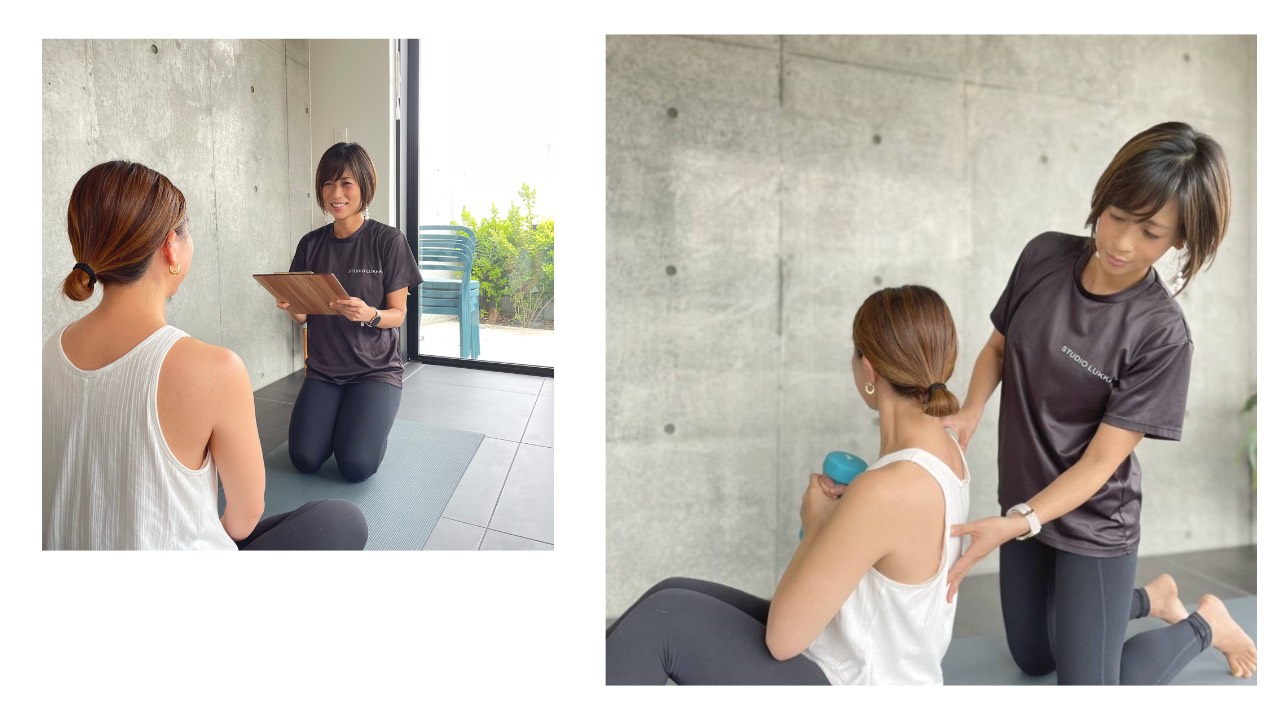 ダイエットやボディメイクだけでなく、生理痛、尿漏れなど女性ならではの身体のゆらぎも安心してお話いただけます。お悩みに沿ったトレーニングやケアの方法をお伝えします。